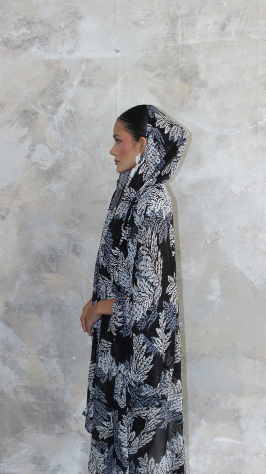 Sommer Black & Blue Leaf Print Kimono and Scarf Set